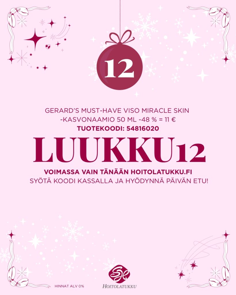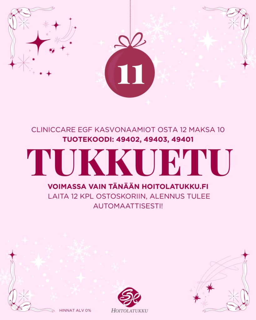 CLINICCARE EGF -kasvonaamiot: Osta 12, maksa 10!(Tuotekoodit: 49402, 49403, 49401) Tänään joulukalenterista paljastuu huikea tukkualennus hoitolasi suosikkinaamioihin! CLINICCARE EGF -sheet maskit ovat tunnettuja tehokkaista aktiiviraaka-aineistaan — ja nyt saat ne […]