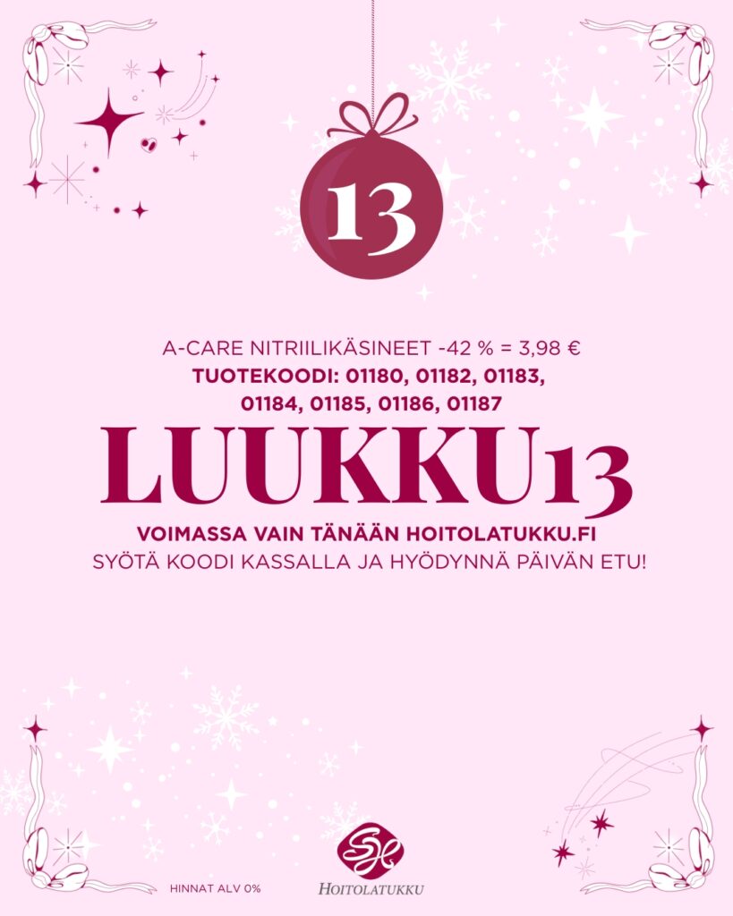 A-care nitriilikäsineet – vain 3,98 € tänään! Tänään joulukalenterista löytyy hoitolan arjen perustuote, jota ei voi koskaan olla liikaa varastossa. A-care nitriilikäsineet suojaavat tehokkaasti vaarallisilta kemikaaleilta ja mikro-organismeilta. Ne ovat […]