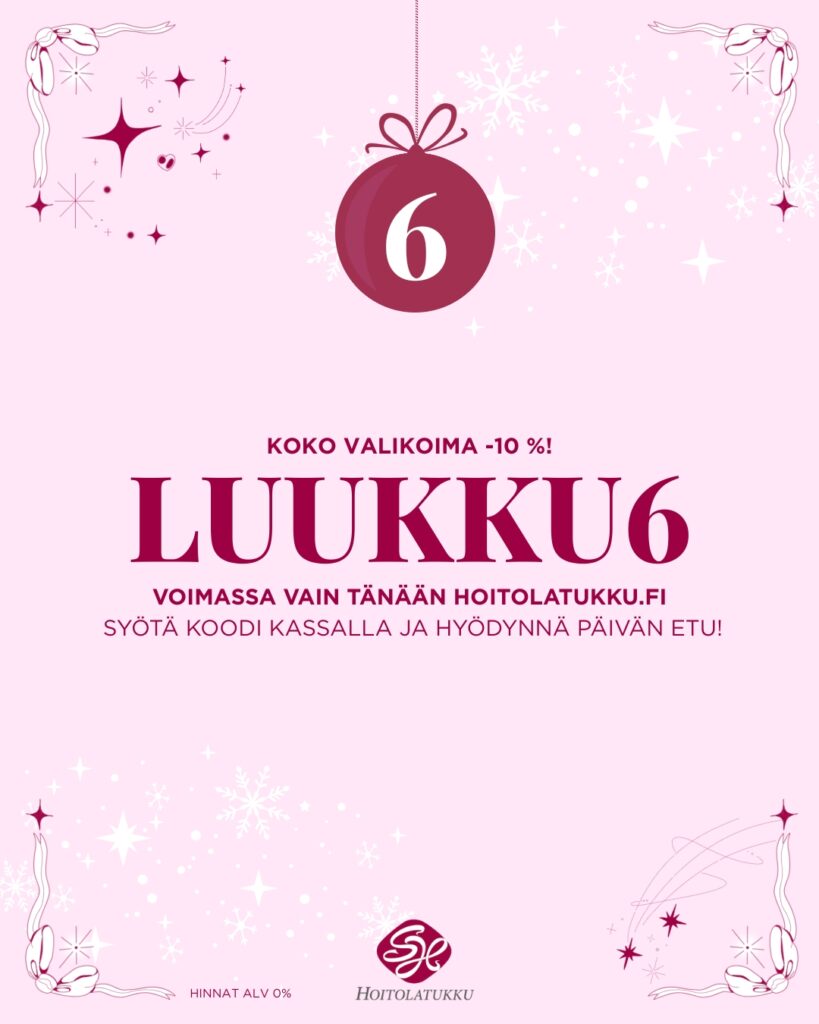 Itsenäisyyspäivän erikoisetu – koko valikoima -10 % tänään! Juhlistetaan Suomen itsenäisyyspäivää tarjoamalla etu, joka koskee jokaista tuotetta Hoitolatukun verkkokaupassa. Olipa kyse hoitolatarvikkeista, jalkahoitotuotteista, ihonhoidosta tai lisämyyntiin sopivista sesonkisuosikeista – tänään […]