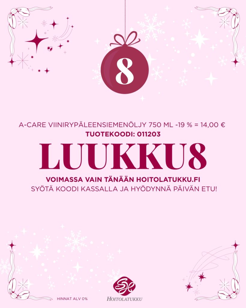 a-care Viinirypäleensiemenöljy 750 ml – vain 14 €!Tuotekoodi: 011203 Tämän päivän luukku on hoitoloiden vakiosuosikki: a-care Viinirypäleensiemenöljy on kevyt, tuoksuton ja erittäin riittoisa hierontaöljy, joka sopii käytännössä kaikkiin hierontoihin. Öljy […]