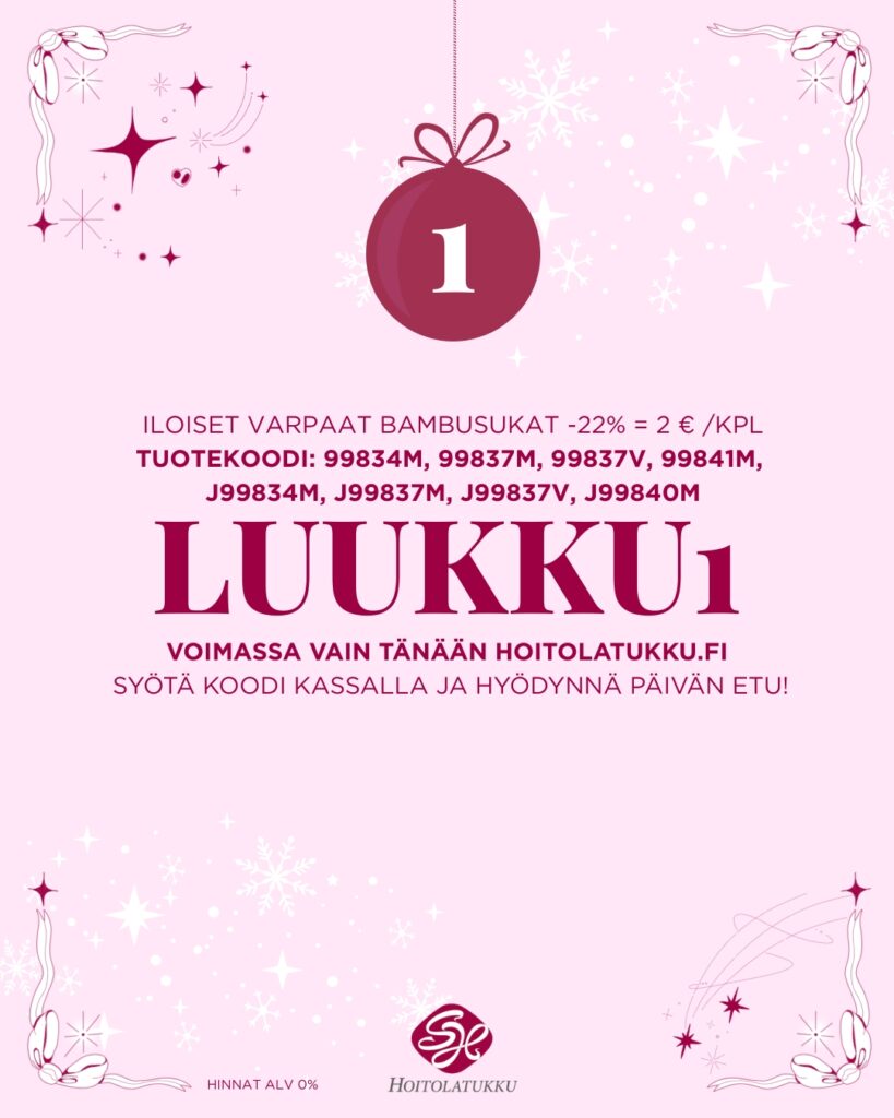 Kaikki Lempi-bambusukat vain 2 € tänään!(tuotekoodit: 99834M, 99837M, 99837V, 99841M, J99834M, J99837M, J99837V, J99840M) Iloiset Varpaat Lempi -bambusukat ovat hoitoloiden varma lisämyyntituote: pehmeät, hengittävät ja miellyttävät jalassa. Ne sopivat mainiosti […]