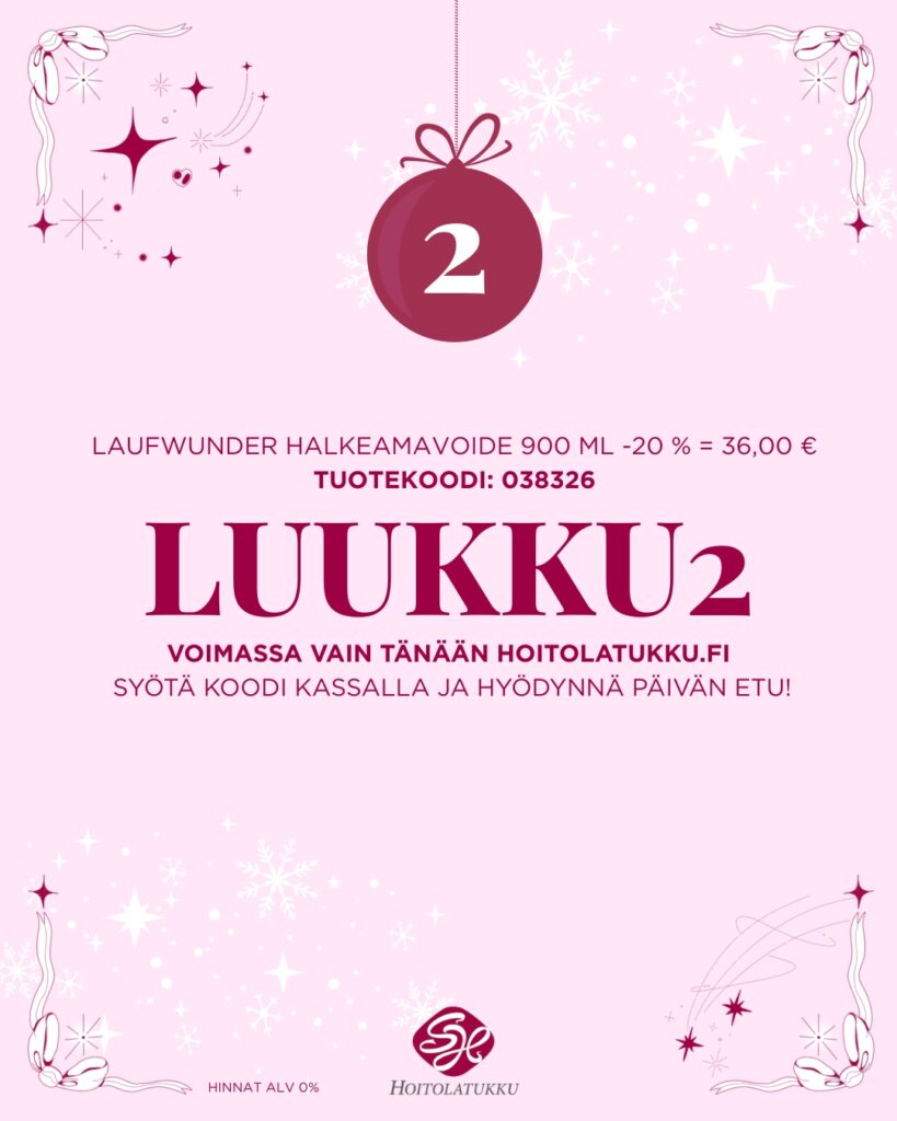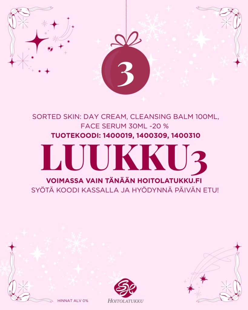 Sorted Skin -tuotteet –20 % vain tänään! Tänään joulukalenterista paljastuu täsmähoitoa punoittavalle, herkälle ja reagoivalle iholle. Sorted Skin -sarja yhdistää prebiootit, rauhoittavat kasviuutteet ja kevyet, tehokkaat koostumukset – täydellinen valinta […]