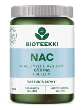 Kotimainen Bioteekki NAC sisältämä kysteiini aminohappo on rakenneosa elimistön glutationi antioksidantille. Bioteekki NAC 650 mg sisältää nyt myös immuniteettia vahvistavaa seleeniä. Yhdessä hyvin imeytyvässä tabletissa on 650 mg N-asetyyli-L-kysteiinia.Laktoositon. Gluteeniton. Hiivaton.