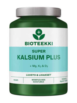 Bioteekki Super Kalsium Plus on ainutlaatuinen valmiste luuston ja lihasten hyvinvointiin. Tuote sisältää kasviperäistä AlgaeCal®-kalsiumia, joka on erinomaisesti imeytyvä ja helposti elimistön hyväksikäytettävissä. Monipuolinen valmiste sisältää myös magnesiumia sekä luonnollisia, hyvin imeytyviä D3- ja K-vitamiineja, jotka edistävät luuston pysymistä normaalina. Magnesium ja kalsium edistävät myös lihasten normaalia toimintaa. Tuote on laktoositon, maidoton ja liivatteeton. Ei sisällä gluteenipitoisen viljan ainesosia eikä eläinperäisiä ainesosia.