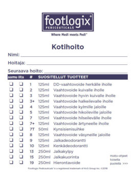 Footlogix -kotihoitolehtiö on tarkoitettu myyntituotteiden edistämiseen. Täytä lehtiöön ne tuotteet, joita suosittelet asiakkaalle juuri sillä hoitokerralla. Repäise lehti irti ja anna asiakkaan mukaan.