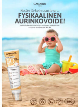 Gamarde Bébé lasten aurinkosuojavoide SPF 50 erittäin korkealla suojakertoimella, sopii päivittäiseen ihonhoitoon kesäaikana.