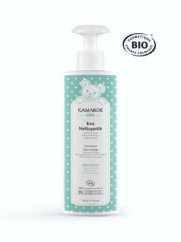 Gamarde Bebe -rauhoittava ja kosteuttava puhdistusvesi herkälle vauvan iholle. Ota painopumpulla vanutyyny kosteaksi ja pyyhi iho puhtaaksi. Ei kirvele silmissä.
