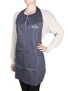 Gerard’s-esiliina on valmistettu laadukkaasta materiaalista ja siinä on kauniit valkoiset yksityiskohdat. Esiliinan edessä on iso tasku, rinnassa Gerard’s-logo ja niskassa kaksi vaalean sävyistä nappia, jotka viimeistelevät kokonaisuuden. Valmistettu 100 % puuvillasta. Pesu 40 asteessa.