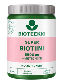 Bioteekki Super Biotiini on vahva valmiste iholle, hiuksille ja limakalvoille. Valmisteessa on sekä biotiinia että metioniinia. Biotiini edistää hiusten, ihon ja limakalvojen pysymistä normaalina. Biotiini edistää myös normaalia energia-aineenvaihduntaa ja normaaleja psykologisia toimintoja. Metioniini on rikkipitoinen aminohappo, joka osallistuu keratiinin muodostukseen.