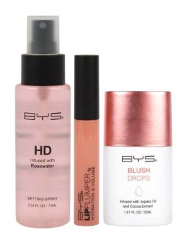 BYS Glam Drop Trio yhdistää kauniisti säteilevän Blush Drops Healthy Glow -poskipunatipat, huulia täyteläistävän ja sävyttävän Lip Plumper Peachy Pout -huulikiillon sekä kosteuttavan ja meikin lukitsevan HD Setting Spray – meikinkiinnityssuihkeeen ruusuvedellä.