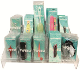 Tweezerman Myyntiteline. Medium, johon saat houkuttelevasti esille huippupinsetit ja muut kauneudenhoitovälineet. Medium-telineessä tilaa kymmenelle tuoteriville.