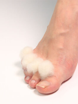 Pese ja kuivaa jalat huolellisesti, erityisesti varpaiden välit. Muotoile villasta pötkö varpaiden alle ja nosta silmukat varpaiden väliin. Vaihda villa puhtaaseen päivittäin.