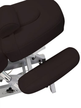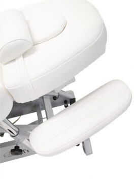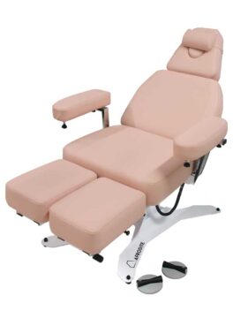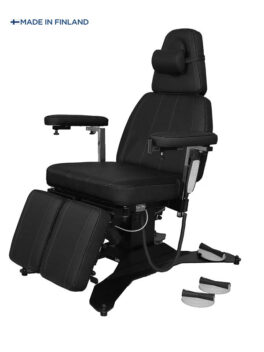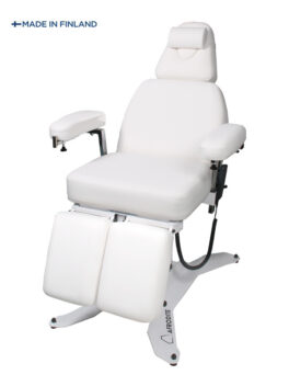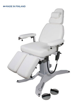 Hillitty harmaa runko sopii jokaisen hoitolan tyyliin. Päällinen on helppohoitoinen ja erikoispehmuste sen sisällä pysyy kuosissa ja suo asiakkaalle miellyttävän hoitokokemuksen. Tuoliin on helppo istuutua ja siinä on reilusti leveyttä. Tuolin käsinojan alapuolella on teline luuppilamppua varten, jolloin valon voi kohdistaa yhtä helposti niin kasvoille kuin jaloillekin. Siirtopyörien avulla tuolia voi kevyesti liikutella nostamalla jalkopäästä.