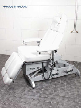 Uusi Afrodite –hoitotuoli on hoitolasi tärkein kaluste ja katseenvangitsija. Se on entistä tyylikkäämpi: hillitty harmaa runko sopii jokaisen hoitolan tyyliin. Päällinen on helppohoitoinen ja erikoispehmuste sen sisällä pysyy kuosissa ja suo asiakkaalle miellyttävän hoitokokemuksen. Tuoliin on helppo istuutua ja siinä on reilusti leveyttä. Tuolin käsinojan alapuolella on teline luuppilamppua varten, jolloin valon voi kohdistaa yhtä helposti niin kasvoille kuin jaloillekin. Siirtopyörien avulla tuolia voi kevyesti liikutella nostamalla jalkopäästä.