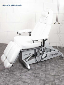 Afrodite-hoitotuoli on hoitolasi tärkein kaluste ja katseenvangitsija. Se on entistä tyylikkäämpi ja helppokäyttöisempi: hillitty harmaa runko sopii jokaisen hoitolan tyyliin. Päällinen on helppohoitoinen ja erikoispehmuste sen sisällä pysyy kuosissa ja suo asiakkaalle miellyttävän hoitokokemuksen. Tuoliin on helppo istuutua ja siinä on reilusti leveyttä. Tuolin käsinojan alapuolella on teline luuppilamppua varten, jolloin valon voi kohdistaa yhtä helposti niin kasvoille kuin jaloillekin. Siirtopyörien avulla tuolia voi kevyesti liikutella nostamalla jalkopäästä.