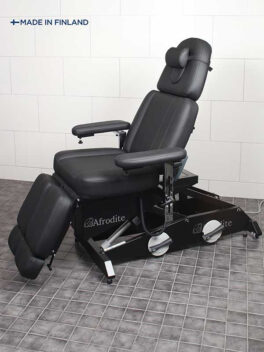 Uusi Afrodite –hoitotuoli on hoitolasi tärkein kaluste ja katseenvangitsija. Se on entistä tyylikkäämpi ja sen runko on kokonaan musta. Päällinen on helppohoitoinen ja erikoispehmuste sen sisällä pysyy kuosissa ja suo asiakkaalle miellyttävän hoitokokemuksen. Tuoliin on helppo istuutua ja siinä on reilusti leveyttä. Tuolin käsinojan alapuolella on teline luuppilamppua varten, jolloin valon voi kohdistaa yhtä helposti niin kasvoille kuin jaloillekin. Siirtopyörien avulla tuolia voi kevyesti liikutella nostamalla jalkopäästä.