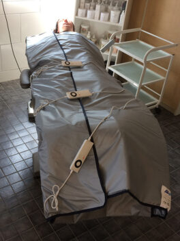 Poistuva tuote. Ylellinen, suurikokoinen lämpöpeitto pitää asiakkaasi lämpöisenä pitkissäkin hauteissa tai vartalokääreissä. Peitteessä on 3 sektoria, joita voi käyttää erikseen. Säätö 0-1-2-3-0. Kiinnitys tarroilla. Materiaali sisäpuolelta 100 % polyester, ulkopinta antibakteerista ”VANQUISH” -materiaalia. Pakkaukseen sisältyy jatkojohto.