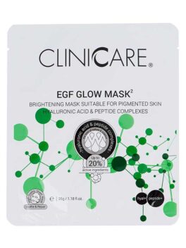 CLINICCARE EGF Glow –naamio on tarkoitettu ihon pigmenttihäiriöiden tasoittamiseen sekä ikääntymisen merkkien pehmentämiseen. Tämä ravitseva kangasnaamio sisältää sekoituksen matalamolekyylistä hyaluronihappoa, arbutinia ja argirelineä, jotka yhdessä kosteuttavat ihoa tehokkaasti sekä kirkastavat auringon vahingoittamaa ihoa. Naamioon lisätyt kasviuutteet pehmentävät ja tasoittavat kuivuudesta kärsivää ihoa. Tulokset säilyvät vielä pitkään naamion poistamisen jälkeen.