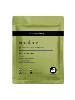 +maskology SQUALANE Professional Sheet Mask -kangasnaamio kosteuttaa ja ravitsee ihoa tehokkaasti, tehden siitä nuorekkaan ja energisen. Hedelmäsekoitus hyödyntää oliivin, passionhedelmän, appelsiiniöljyn (luomu) ja manteliöljyn (luomu) voimaa, luoden ikääntymistä hidastavan koostumuksen, nuorentaen ja rauhoittaen ihoa.