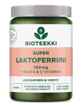 Bioteekki Super Laktoferriini + rauta & C -vitamiini on monipuolinen ravintolisä raudan imeytymisen tueksi. Laktoferriini on maidon luonnollinen ainesosa, joka sitoo rautaa itseensä jo suolistossa. Valmisteeseen lisätty rauta on hyvin imeytyvässä ja vatsaystävällisessä rautabisglysinaatti -muodossa. Rauta edistää normaalia energia-aineenvaihduntaa ja hapen kuljetusta kehossa sekä auttaa vähentämään väsymystä ja uupumusta. Se edistää myös normaalia punaisten verisolujen ja hemoglobiinin muodostumista. Lisätty C -vitamiini parantaa raudan imeytymistä ja edistää immuunijärjestelmän normaalia toimintaa, sekä auttaa myös vähentämään väsymystä ja uupumusta.