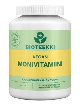Vegan Monivitamiini on monipuolinen monivitamiinivalmiste, joka on suunniteltu päivittäiseen käyttöön vegaaniruokavalion tueksi. Tasapainoinen ja vahva koostumus sisältää 28 aktiiviainetta vitamiineja ja hivenaineita mm. B12-vitamiinia, kasviperäistä D3-vitamiinia, K2-vitamiinia, sinkkiä ja jodia. Pienikokoinen ja liukas tabletti on helppo niellä. Tuote on gluteeniton, laktoositon ja maidoton. Valmiste on on 100% vegaaninen ja The Vegan Societyn hyväksymä.