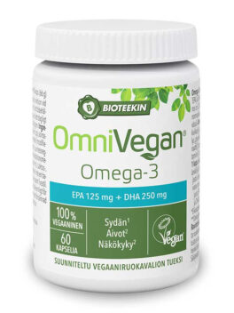 OmniVegan® Omega-3 sisältää vahvat pitoisuudet EPA- ja DHA-rasvahappoja. Riittävä hyvien rasvahappojen saanti on tärkeää meille kaikille. Ihmiselle välttämättömät rasvahapot ovat alfalinoleenihappo (omega-3-rasvahappo) ja linolihappo (omega-6-rasvahappo). Optimitilanteessa näistä rasvahapoista elimistö voi valmistaa kaikki tarvitsemansa rasvahapot. Vegaani saa hyviä rasvahappoja esimerkiksi pähkinöistä ja siemenistä sekä kasviöljyistä. Näissä ruoka-aineissa omega-3-rasvahappo on perusmuodossa olevaa alfalinoleenihappoa, ja siitä elimistön tulee valmistaa pitkäketjuisempia rasvahappoja EPA:aa ja DHA:ta. OmniVegan® Omega-3 sisältää EPA- ja DHA-rasvahappoja levästä. Valmiste on laktoositon, maidoton ja liivatteeton. OmniVegan® Omega-3 on 100% vegaaninen, The Vegan Societyn hyväksymä valmiste.
