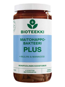 Bioteekki BalanticPro Plus on nyt Bioteekki Maitohappobakteeri Plus! Se on Suomessa jo yli 20 vuoden ajan valmistettu, laadukas maitohappobakteerivalmiste. Tuote sisältää neljää tutkittua maitohappobakteerikantaa. Lisäksi siinä on bakteereiden hyvinvointia tukevia aineita. Bioteekki Maitohappobakteeri Plus sopii käytettäväksi päivittäin tai kuuriluontoisesti ja se soveltuu koko perheelle. Tuotteen kapselikuorilo on kasviperäinen. Kapselin voi tarvittaessa avata ja sekoittaa viileään ruokaan. Tuote saattaa sisältää jäämiä maidosta ja soijasta, jotka ovat peräisin bakteereiden kasvatusliuoksesta. Tuotteella on Valmistettu Suomessa -Avainlippu-tunnus.