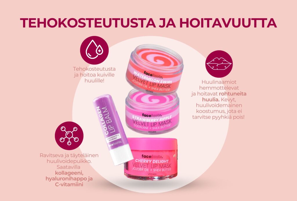 ✔️ Face Facts Velvet Bliss -huulinaamiot – Ylelliset huulinaamiot (3 kpl/pkt), jotka kosteuttavat ja hoitavat syvältä. Kevyen, huulivoidemaisen koostumuksen voi jättää huulille vaikuttamaan. Mansikan tuoksuinen naamio sisältää kosteuttavaa skvalaania ja sheavoita, kun taas vesimelonin ja kirsikan tuoksuiset naamiot hoitavat huulia tehokkaasti jojobaöljyn ja sheavoin avulla.