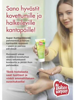 Sarjajuliste Iloiset Varpaat Super Kantapäävoide, koko 50×70 cm, materiaali julistepaperi.