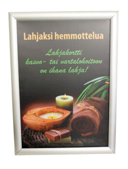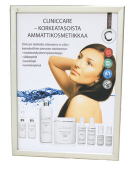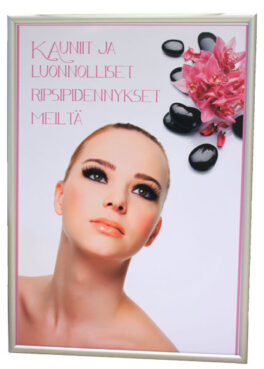 Ripusta mainoksesi tyylikkäästi uutuuskehyksellä. Pyöristetyn listan leveys 35 mm. Kuvan vaihto käy näppärästi napsauttamalla kehys auki. Pakkaus sisältää kiinnitysruuvit.