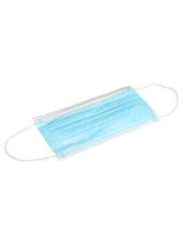 Kolmikerroksinen kuitukangasmaski korvalenkeillä hoitolakäyttöön. Korvalenkkien materiaali polyester.