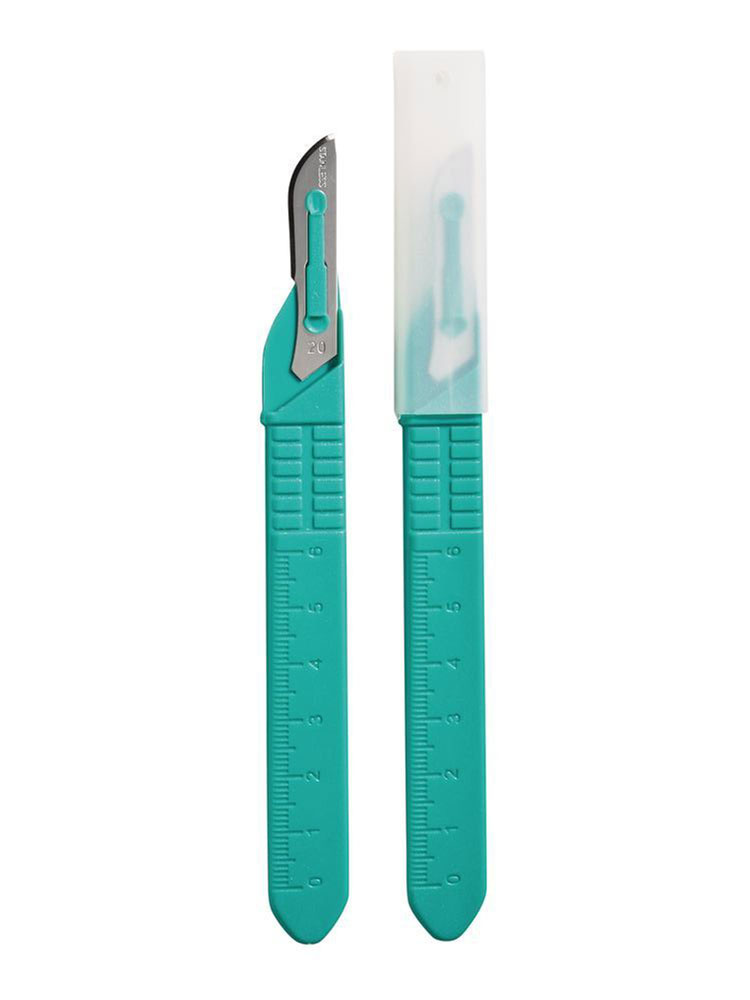 Ruostumattomasta teräksestä valmistettu kertakäyttöinen veitsenterä muovisella varrella. Yksittäin pakattu, steriili, terä suojattu erikseen muovikuorella.