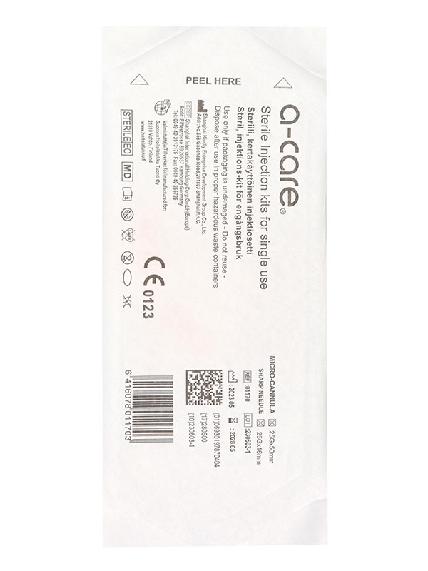 Suora, kertakäyttöinen, tylppäkärkinen kanyyli + preretinaali neula. Luer-lock kiinnitys. Steriili. CE-merkitty. Pakkauksessa 25 kpl.