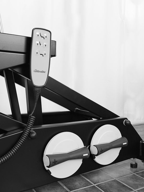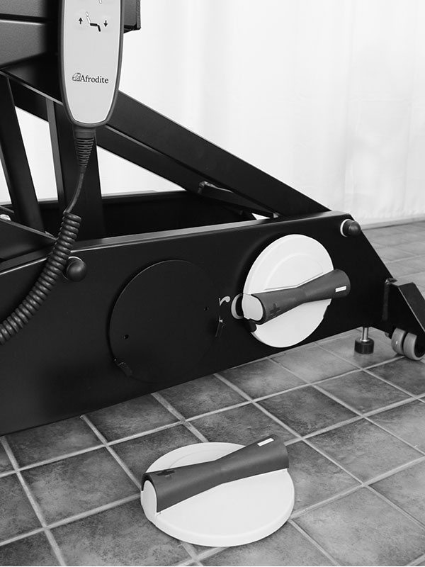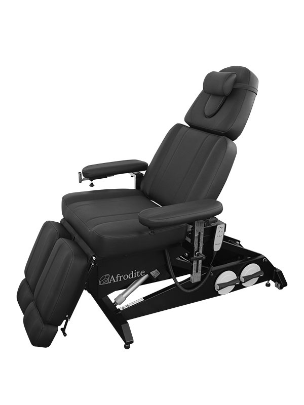 Uusi Afrodite –hoitotuoli on hoitolasi tärkein kaluste ja katseenvangitsija. Se on entistä tyylikkäämpi ja sen runko on kokonaan musta. Päällinen on helppohoitoinen ja erikoispehmuste sen sisällä pysyy kuosissa ja suo asiakkaalle miellyttävän hoitokokemuksen. Tuoliin on helppo istuutua ja siinä on reilusti leveyttä. Tuolin käsinojan alapuolella on teline luuppilamppua varten, jolloin valon voi kohdistaa yhtä helposti niin kasvoille kuin jaloillekin. Siirtopyörien avulla tuolia voi kevyesti liikutella nostamalla jalkopäästä.