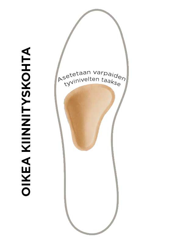 2. Pelotin tarkoituksena on nostaa jalan poikittaiskaarta ylöspäin ja erottaa jalkapöytäluita toisistaan. Oikea paikka pelotille on jalkaterän keskilinjalla, varpaiden tyvinivelten takana.