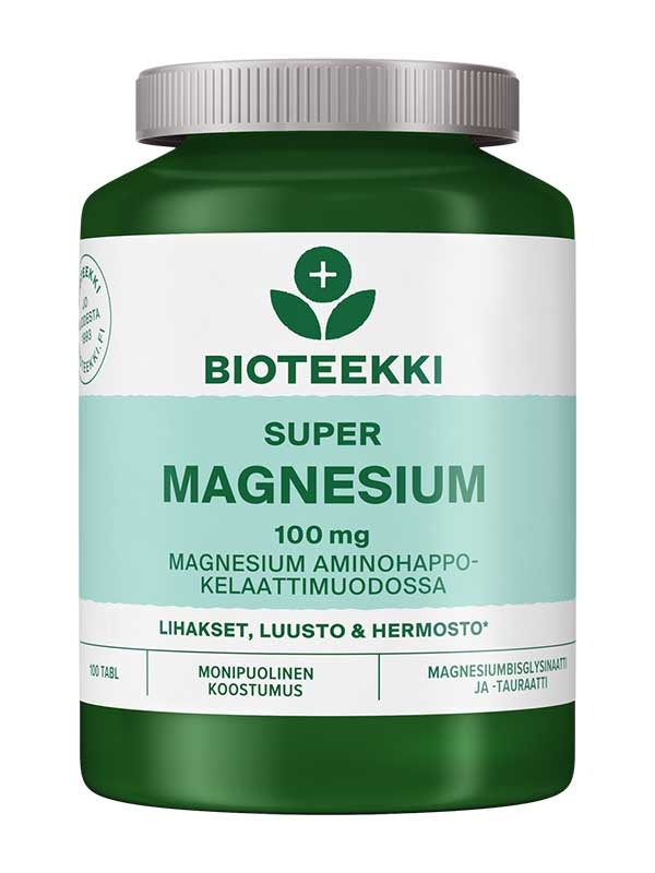 Bioteekki Super Magnesium on ainutlaatuisen tehokas ja nopeavaikutteinen magnesiumvalmiste. Super Magnesiumissa magnesium on heti valmiina imeytyvässä aminohappokelatoidussa muodossa, minkä ansiosta se imeytyy nopeasti ja tehokkaasti. Magnesium edistää hermoston ja lihasten normaaleja toimintoja ja auttaa siten palautumaan päivän koitoksista. Magnesium edistää myös normaaleja psykologisia toimintoja, joiden toiminta on tärkeä rauhoittumisessa.