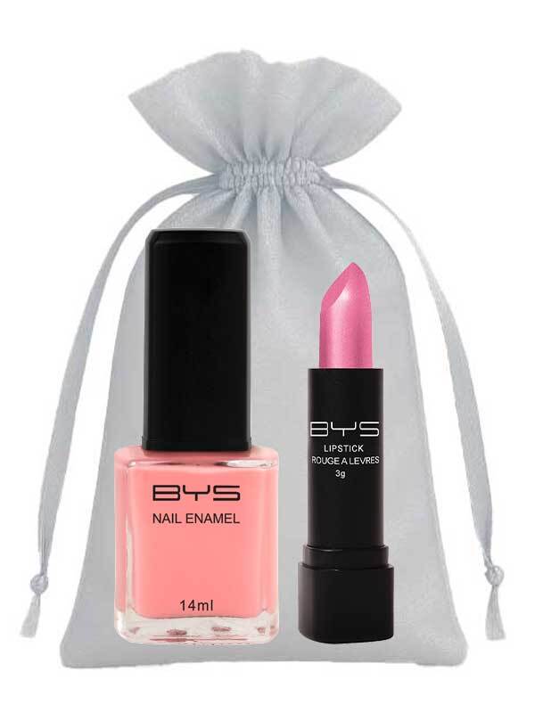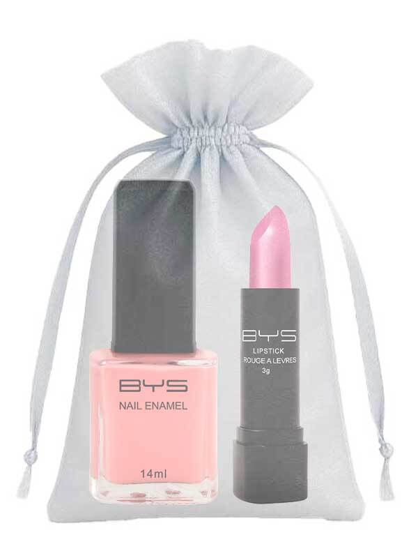 BYS Lip & Nail Soft Pink -setti on suloinen lahjasetti, joka yhdistää pehmeän pinkin huulipunan ja hennon vaalean kynsilakan tyylikkäässä hopeisessa organzapussissa: