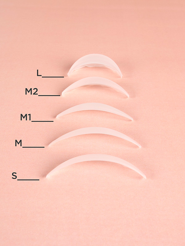Taivutusmuotit on suunniteltu tarkasti sopimaan jokaisen asiakkaan silmän muotoon. Tuotteen silikoni on poikkeuksellisen pehmeää, joten se tuntuu asiakkaasta miellyttävältä ja sen asetteleminen oikeaan muotoon on helppoa, myös hyvin pienisilmäisen asiakkaan kohdalla. Muotin reunat on kaarrettu, jotta sen asettaminen silmään ilman riskiä muotin irtoamisesta on helpompaa. Taivutusmuotti tulee asettaa tarkasti mahdollisimman lähelle ripsirajaa. Muotin koko ja kaarevuus on merkattu muotin ulkosyrjään. Pakkauksessa on 10 kpl. Taivutusmuotteja on saatavilla 5 eri kokoa (S, M, M1, M2 ja L). Katso kuvasta kokoerot!