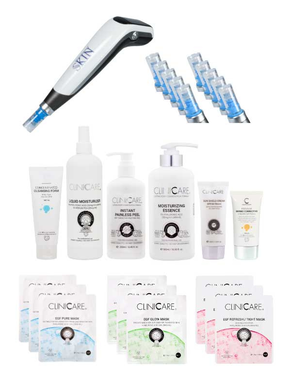 CLINICCARE Mikroneulaus aloituspaketti sisältää kaiken tarvittavan laadukkaaseen ja ammattimaiseen mikroneulaushoitoon. Tämä huolellisesti koottu paketti yhdistää Scandinavian Skin -mikroneulausteknologian ja CLINICCARE-ihonhoitotuotteiden syvävaikutteiset tehot, tarjoten asiakkaillesi parhaat mahdolliset hoitotulokset.
