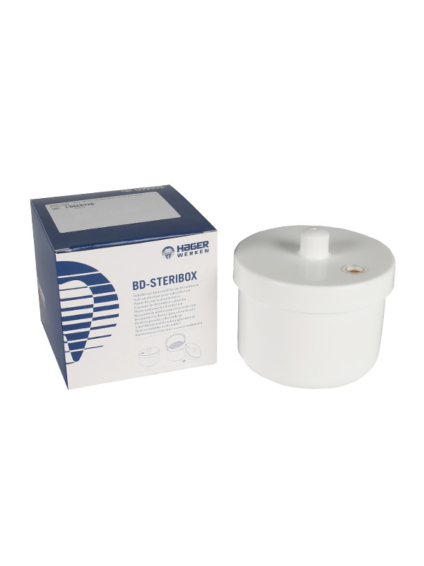 Desinfiointipurkissa on reiällinen sisäosa jonka avulla poranterät on helppo huuhtoa.