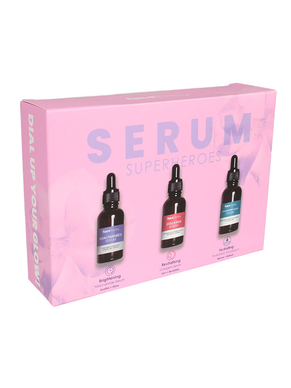 Tehosta ihoasi Face Facts Superheroes -seerumisetillä (3 x 30 ml). Niasiiniamidi-, kollageeni- ja hyaluronihapposeerumit toimivat yhdessä kirkastaen ja kosteuttaen ihoasi.
