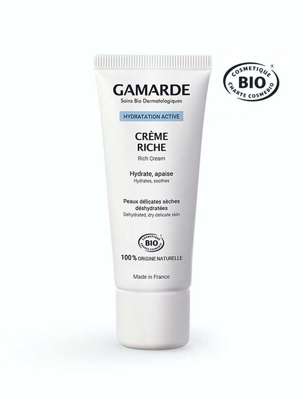 Aqua (Water), Gamarde aqua (Gamarde Water), Aloe barbadensis leaf extract*, Corylus avellana (Hazel) seed oil*, Glycerin, polyglyceryl-6 distearate, squalane, parfum (Fragrance), stearic acid, Argania spinosa (Argan) kernel oil*, cetyl alcohol, Jojoba esters, xylitylglucoside, anhydroxylitol, Helianthus annuus (Sunflower) seed wax, glyceryl stearate, glyceryl stearate citrate, Cinnamomum camphora (Camphor) bark oil, Lavandula hybrida (Lavandin) oil*, Cymbopogon martini (Palmarosa) oil*, tocopherol, sodium hyaluronate, glyceryl caprylate, microcrystalline cellulose, cellulose gum, cellulose, xylitol, Acacia decurrens flower wax, polyglycerin-3, xanthan gum, citric acid, citral, farnesol, geraniol, limonene, linalool.