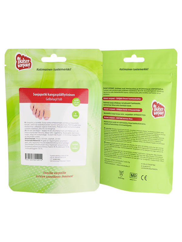 Varpaille ja sormille. Suoja auttaa ehkäisemään painetta ja kipua esim. känsän, rakon tai sisäänkasvaneen kynnen aiheuttamana. Pehmeä geeli kosteuttaa ihoa. Leikataan sopivan kokoiseksi. Putken pituus noin 15 cm. Pidä päivittäin 3-4 tuntia taukoa tuotteen käytössä, jotta iho voi hengittää.