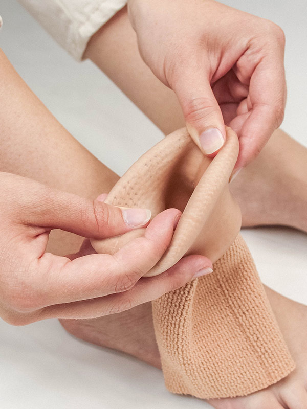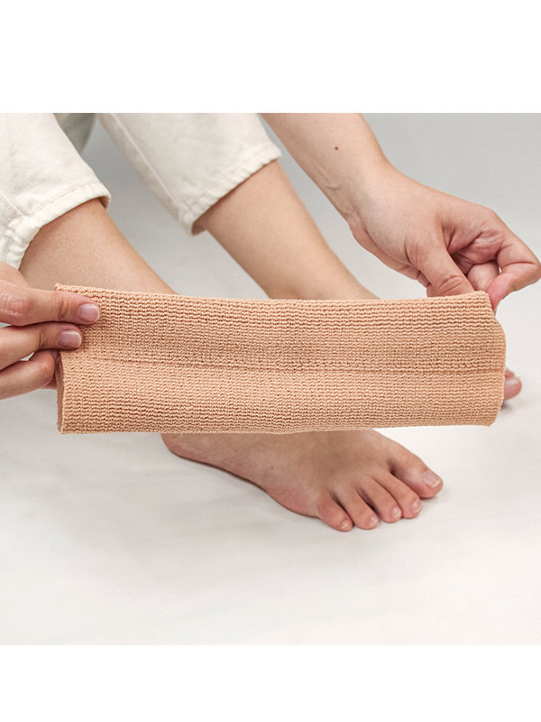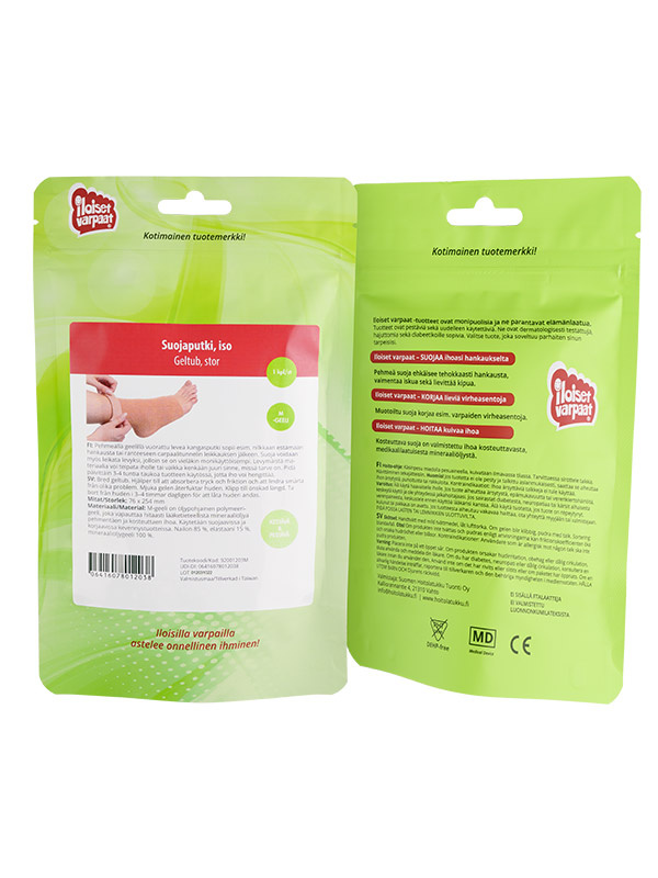 Pehmeällä geelillä vuorattu leveä kangasputki sopii esim. nilkkaan estämään hankausta tai ranteeseen carpaalitunnelin leikkauksen jälkeen. Suoja voidaan myös leikata levyksi, jolloin se on vieläkin monikäyttöisempi. Levymäistä materiaalia voi teipata iholle tai vaikka kenkään juuri sinne, missä tarve on. Pidä päivittäin 3-4 tuntia taukoa tuotteen käytössä, jotta iho voi hengittää.