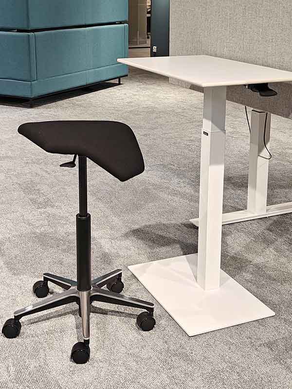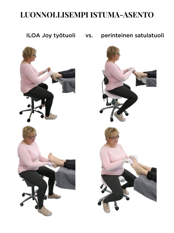 Toisin kuin perinteisessä satulatuolissa, tässä mallissa istuma-asento säilyy luonnollisena – jalkojen ei tarvitse olla leveästi harallaan, vaan ne voi pitää mukavasti normaalissa asennossa. Tämä parantaa työskentelymukavuutta ja auttaa ehkäisemään turhia jännityksiä kehossa.