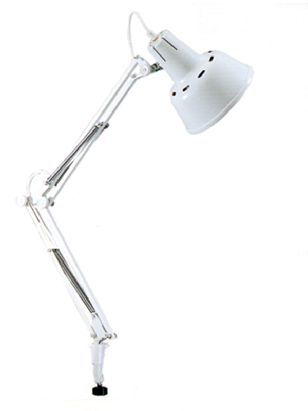 Metallia, taittuva jalka. Pöytäkiinnike ja polttimo sisältyvät toimitukseen. Lampun tehoa voidaan säätää kytkimellä (himmennin).