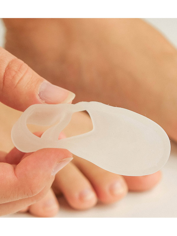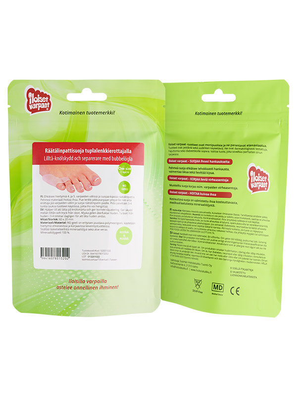 Ehkäisee hiertymiä 4. ja 5. varpaiden välissä ja suojaa kipeää räätälinpattia. Pehmeä materiaali hoitaa ihoa. Pue lenkki pikkuvarpaan ympärille niin että erottaja jää varpaiden väliin ja suoja räätälinpatin päälle. Pidä päivittäin 3-4 tuntia taukoa tuotteen käytössä, jotta iho voi hengittää.