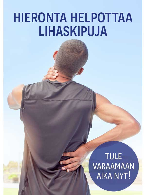 Kausijuliste Hieronta helpottaa lihaskipuja 50 x 70 cm, materiaali julistepaperi.