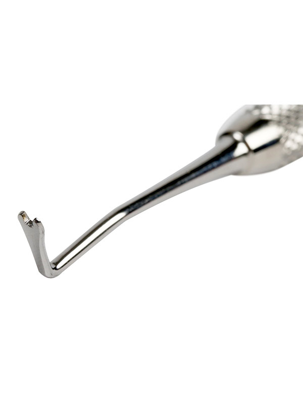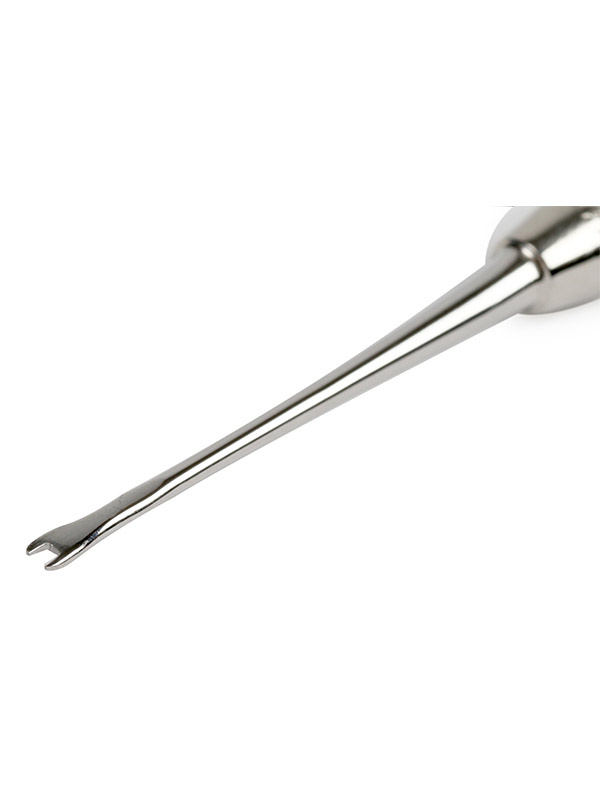 Ergonominen varsi ja kaksipäinen, suoralla ja kaarevalla päällä varustettu täsmäinstrumentti titaanilangan asentamiseen oikeaan asentoon.