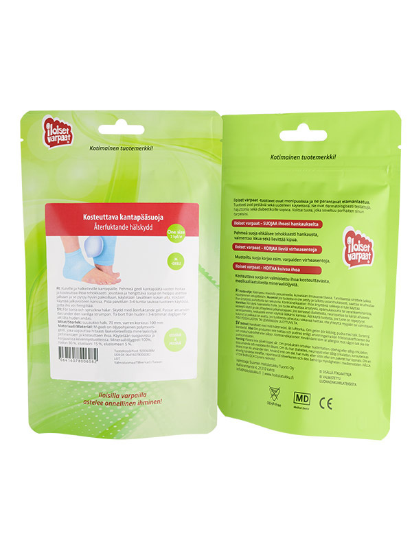 Kuiville ja halkeileville kantapäille. Pehmeä geeli kantapäätä vasten hoitaa ja kosteuttaa ihoa tehokkaasti. Joustava ja hengittävä suoja on helppo asettaa jalkaan ja se pysyy hyvin paikoillaan, käytetään tavallisen sukan alla. Voidaan käyttää jalkavoiteen kanssa. Pidä päivittäin 3-4 tuntia taukoa tuotteen käytössä, jotta iho voi hengittää.